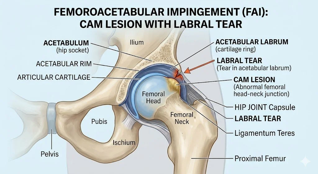 The surgeon reshapes the bone to prevent pinching and repairs the labrum if torn.